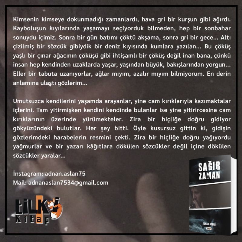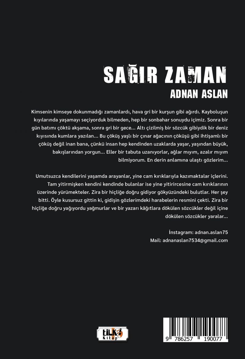 Adnan Aslan 10 Şubat 1986 da Ardahan da doğdu.Edebiyat dünyasında adından söz ettiren yazar ilk romanı sağır zaman Eylül 2020 yılında okurla buluştu.Gerek romanın üslubu gerekse kullandığı dil sarsıcı ve aynı zamanda sürükleyici bir yol edindi kendine.Kendi okur kitlesiyle sözcüklerinde buluşan yazar romanda hem anlatıcı hem karakter sanki okurla konuşmasını çok iyi biliyor.İnsanı derin bir hüzne sürükleyen karmaşık bir tarafı var bu romanın izahı zor bir tarafı.Olaylardan ziyade düşünceler hakim düşüncelerle insanın ve yaşamın kör karanlık kıyılarında geziniyor ayak izlerini bırakmadan.Hayatını İstanbul Ümraniye`de sürdüren yazar yazma serüvenine devam ediyor aynı zamanda iş hayatını otomotiv sektöründe sürdürüyor.Edebiyat insanı kendine merhaba demeye davet eder kendi karanlığını görmeye biraz olsun kendini anlamaya davet eder ,çünkü insan en çok kendine yabancıdır kendine karanlık der yazar.Onda huzur bırakmayan şeyin uzun yıllardır sözcüklere devrilmesine rağmen kağıtlara dökemediğini ifade eder.Yaşam ruhunda taşıdığın meşale gibidir der yazar ,alevlerle başlar,kor olur ilerler ve kül olup yok olurlar.Gülümse asıl yok oluşlar varoluşun kapıların açar ve üzülme acılarına izin ver çünkü yalnızca acıların kalbini temizler ve ancak ruhlarındaki meşaleyi söndürmeden ilerleyenler karanlık uçurumları geçebilirler...Çok güzel soğuklar yaşadık zemherinin ortasında.Bu benim yolculuğum yolculuğuma anlam katan herkese teşekkürler...