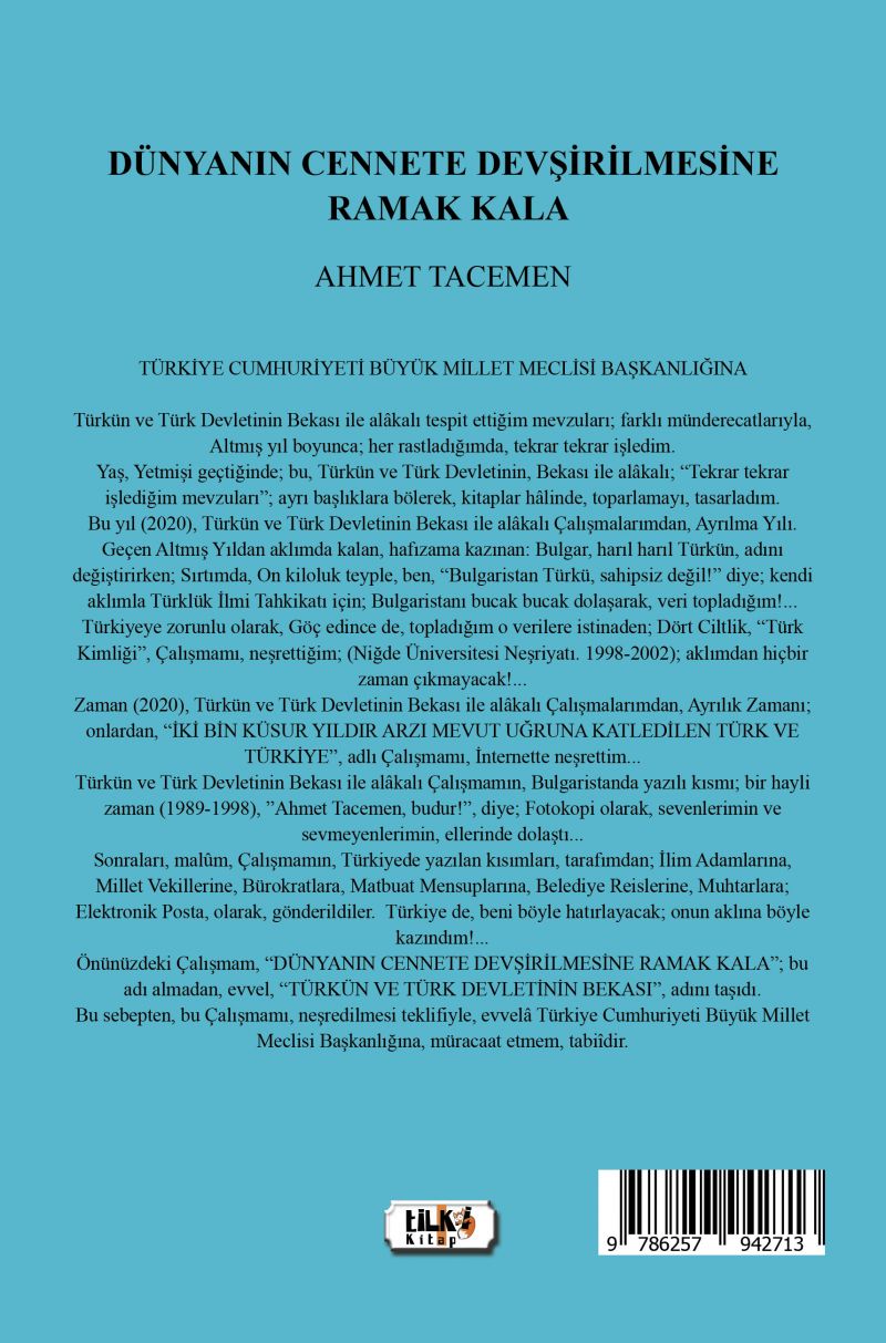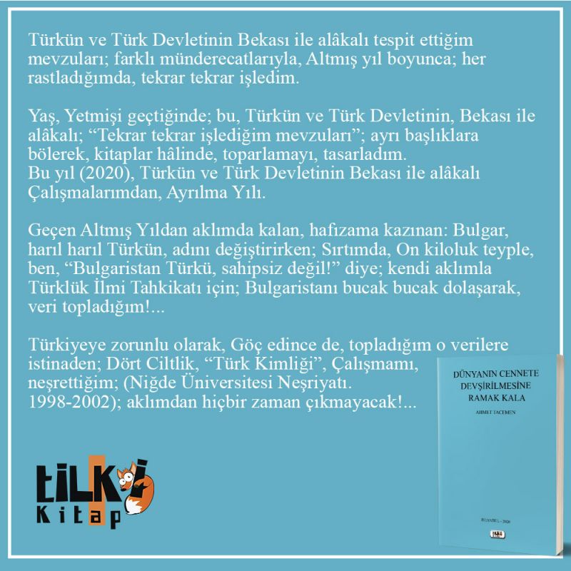 Yaş, Yetmişi geçtiğinde; bu, Türkün ve Türk Devletinin, Bekası ile alâkalı; `Tekrar tekrar işlediğim mevzuları`; ayrı başlıklara bölerek, kitaplar hâlinde, toparlamayı, tasarladım.Bu yıl (2020), Türkün ve Türk Devletinin Bekası ile alâkalı Çalışmalarımdan, Ayrılma Yılı.Geçen Altmış Yıldan aklımda kalan, hafızama kazınan: Bulgar, harıl harıl Türkün, adını değiştirirken; Sırtımda, On kiloluk teyple, ben, `Bulgaristan Türkü, sahipsiz değil!` diye; kendi aklımla Türklük İlmi Tahkikatı için; Bulgaristanı bucak bucak dolaşarak, veri topladığım!... Türkiyeye zorunlu olarak, Göç edince de, topladığım o verilere istinaden; Dört Ciltlik, `Türk Kimliği`, Çalışmamı, neşrettiğim; (Niğde Üniversitesi Neşriyatı.
