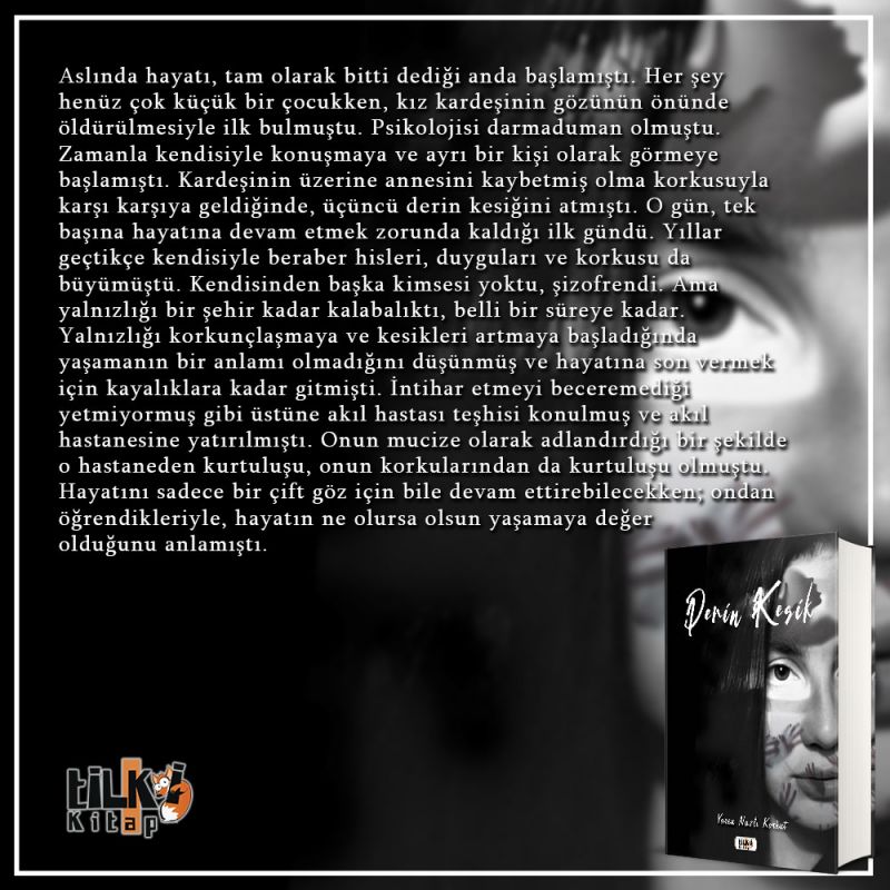 Aslında hayatı, tam olarak bitti dediği anda başlamıştı. Her şey henüz çok küçük bir çocukken kız kardeşinin gözünün önünde öldürülmesiyle ilk bulmuştu. Psikolojisi darmaduman olmuş, zamanla kendisiyle konuşmaya ve ayrı bir kişi olarak görmeye başlamıştı. Kardeşinin üzerine annesini kaybetmiş olma korkusuyla karşı karşıya geldiğinde, üçüncü derin kesiğini atmıştı. O gün, tek başına hayatına devam etmek zorunda kaldığı ilk gündü. Yıllar geçtikçe kendisiyle beraber hisleri, duyguları ve korkusu da büyümüştü. Kendisinden başka kimsesi yoktu, şizofrendi. Ama yalnızlığı bir şehir kadar kalabalıktı, belli bir süreye kadar. Yalnızlığı korkunçlaşmaya ve kesiklerini artmaya başladığında yaşamanın bir anlamı olmadığını düşünmüş,ve hayatına son vermek için kayalıklara kadar gitmişti. İntihar etmeyi bile beceremediği yetmiyormuş gibi üstüne akıl hastası teşhisi konulmuş, ve akıl hastanesine yatırılmıştı. Onun mucize olarak adlandırdığı bir şekilde o hastaneden kurtuluşu, onun korkularından da kurtuluşu olmuştu, Hayatını sadece bir çift göz için bile devam ettirebilecek iken ondan öğrendikleriyle, hayatın ne olursa olsun yaşamaya değer olduğunu anlamıştı.