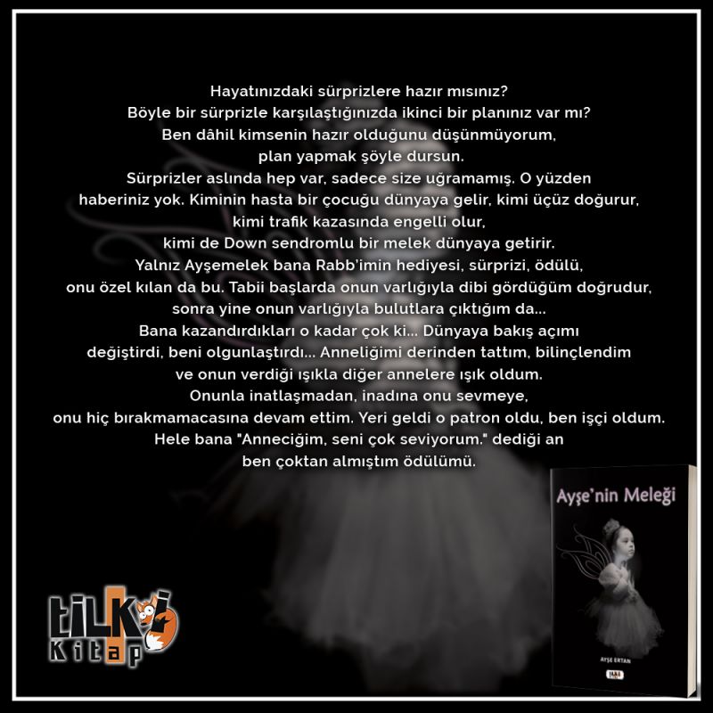 Ben dâhil kimsenin hazır olduğunu düşünmüyorum, plan yapmak şöyle dursun.Sürprizler aslında hep var, sadece size uğramamış. O yüzden haberiniz yok. Kiminin hasta bir çocuğu dünyaya gelir, kimi üçüz doğurur, kimi trafik kazasında engelli olur, kimi de Down sendromlu bir melek dünyaya getirir.Yalnız Ayşemelek bana Rabb`imin hediyesi, sürprizi, ödülü, onu özel kılan da bu. Tabii başlarda onun varlığıyla dibi gördüğüm doğrudur, sonra yine onun varlığıyla bulutlara çıktığım da...Bana kazandırdıkları o kadar çok ki... Dünyaya bakış açımı değiştirdi, beni olgunlaştırdı... Anneliğimi derinden tattım, bilinçlendim ve onun verdiği ışıkla diğer annelere ışık oldum.