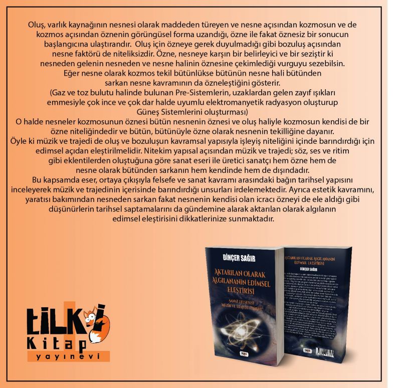 Bu kapsamda eser, ortaya çıkışıyla felsefe ve sanat kavramı arasındaki bağın tarihsel yapısını inceleyerek müzik ve trajedinin içerisinde barındırdığı unsurları irdelemektedir. Ayrıca estetik kavramını, yaratısı bakımından nesneden sarkan fakat nesnenin kendisi olan icracı özneyi de ele aldığı gibi düşünürlerin tarihsel saptamalarını da gündemine alarak aktarılan olarak algılanın edimsel eleştirisini dikkatlerinize sunmaktadır.