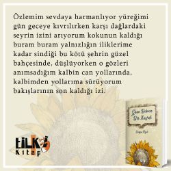 özlemim sevdaya harmanlıyor yüreğimi gün geceye kıvrılırken karşı dağlardaki seyrin izini arıyorum kokunun kaldığı buram buram yalnızlığın iliklerime kadar sindiği bu kötü şehrin güzel bahçesinde, düşlüyorken o gözleri anımsadığım kalbin can yollarında, kalbimden yollarıma sürüyorum bakışlarının son kaldığı izi.