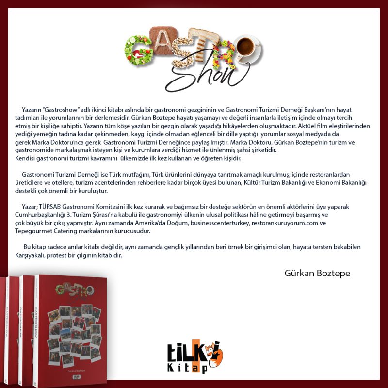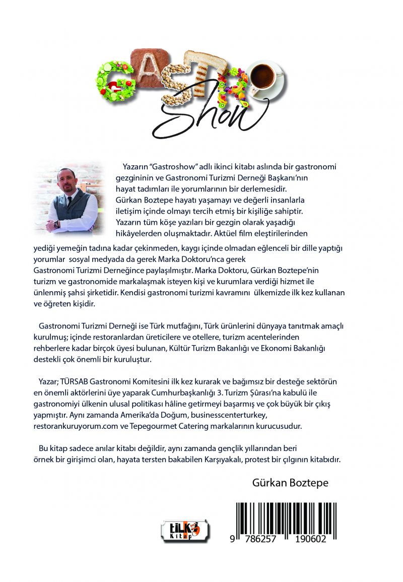 Yazarın `Gastroshow` adlı ikinci kitabı aslında bir gastronomi gezgininin ve Gastronomi Turizmi Derneği Başkanı`nın hayat tadımları ile yorumlarının bir derlemesidir. Gürkan Boztepe hayatı yaşamayı ve değerli insanlarla iletişim içinde olmayı tercih etmiş bir kişiliğe sahiptir. Yazarın tüm köşe yazıları bir gezgin olarak yaşadığı hikâyelerden oluşmaktadır.