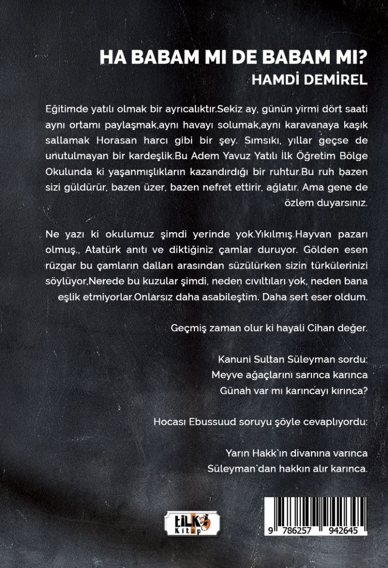 Ne yazı ki okulumuz şimdi yerinde yok.Yıkılmış.Hayvan pazarı olmuş., Atatürk anıtı ve diktiğiniz çamlar duruyor. Gölden esen rüzgar bu çamların dalları arasından süzülürken sizin türkülerinizi söylüyor,Nerede bu kuzular şimdi, neden cıvıltıları yok, neden bana eşlik etmiyorlar.Onlarsız daha asabileştim. Daha sert eser oldum.
