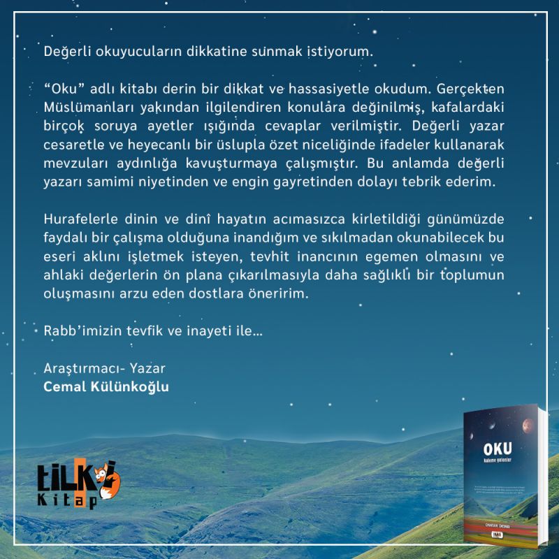 `Oku` adlı kitabı derin bir dikkat ve hassasiyetle okudum. Gerçekten Müslümanları yakından ilgilendiren konulara değinilmiş, kafalardaki birçok soruya ayetler ışığında cevaplar verilmiştir. Değerli yazar cesaretle ve heyecanlı bir üslupla özet niceliğinde ifadeler kullanarak mevzuları aydınlığa kavuşturmaya çalışmıştır. Bu anlamda değerli yazarı samimi niyetinden ve engin gayretinden dolayı tebrik ederim.
