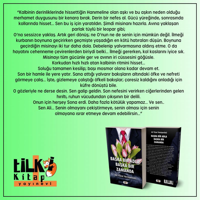 "Kalbinin derinliklerinde hissettiğin Hanımeli`ne olan aşkı ve bu aşkın neden olduğu merhamet duygusunu bir kenara bırak. Derin bir nefes al. Gücü yüreğinde, sonrasında kollarında hisset... Sen bu iş için yaratıldın. Şimdi misinanı hazırla. Avına yaklaşan parlak tüylü bir leopar gibi ona sessizce yaklaş. Artık geri dönüş, ne onun ne de senin için mümkün değil. İlmeği kurbanın boynuna geçirirken geçmişte yaşadığın en kötü hatıraları düşün. Boynuna geçirdiğin misinayı iki tur daha dola. Debelenip yalvarmasına aldırış etme. O da hayatını cehenneme çevirenlerden biriydi belki... İlmeği gererken kol kaslarını iyice sık. Misinayı tüm gücünle ger ve avının iri cüssesini göğüsle. Korkudan hızlı hızlı atan kalbinin ritmini hisset... Soluğu tamamen kesilip başı mosmor olana kadar devam et. Son bir hamle ile yere yatır. Sana attığı yalvarır bakışların altındaki öfke ve nefreti görmeye çalış... İşte, gizlemeye çalıştığı öfkeli bakışlar, çaresiz kaldığını anladığı için küfre dönüştü bile. O gözleriyle ne derse desin. Sen galip geldin. Son nefesini verirken ciğerlerinden gelen hırıltı, ruhun vücudundan çıkışının bir delili. Onun için her şey sona erdi. Daha fazla kötülük yapamaz... Ve sen… Sen Ali... Senin olmayanı çekiştirmeye, senin olması için senin olmayana ısrar etmeye devam edebilirsin..."