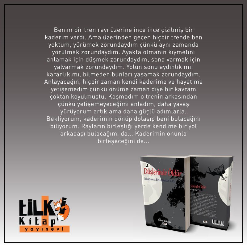 Benim bir tren rayı üzerine ince ince çizilmiş bir kaderim vardı. Ama üzerinden geçen hiçbir trende ben yoktum, yürümek zorundaydım çünkü aynı zamanda yorulmak zorundaydım. Ayakta olmanın kıymetini anlamak için düşmek zorundaydım, sona varmak için yalvarmak zorundaydım. Yolun sonu aydınlık mı, karanlık mı, bilmeden bunları yaşamak zorundaydım. Anlayacağın, hiçbir zaman kendi kaderime ve hayatıma yetişemedim çünkü önüme zaman diye bir kavram çoktan koyulmuştu. Koşmadım o trenin arkasından çünkü yetişemeyeceğimi anladım, daha yavaş yürüyorum artık ama daha güçlü adımlarla. Bekliyorum, kaderimin dönüp dolaşıp beni bulacağını biliyorum. Rayların birleştiği yerde kendime bir yol arkadaşı bulacağımı da... Kaderimin onunla birleşeceğini de...