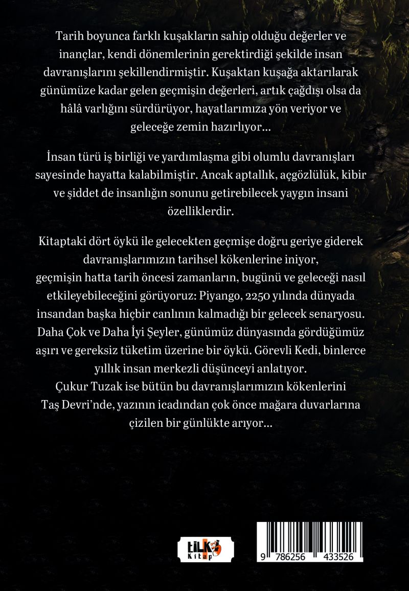Kitaptaki dört öykü ile gelecekten geçmişe doğru geriye giderek davranışlarımızın tarihsel kökenlerine iniyor, geçmişin hatta tarih öncesi zamanların, bugünü ve geleceği nasıl etkileyebileceğini görüyoruz: Piyango, 2250 yılında dünyada insandan başka hiçbir canlının kalmadığı bir gelecek senaryosu. Daha Çok ve Daha İyi Şeyler, günümüz dünyasında gördüğümüz aşırı ve gereksiz tüketim üzerine bir öykü. Görevli Kedi, binlerce yıllık insan merkezli düşünceyi anlatıyor. Çukur Tuzak ise bütün bu davranışlarımızın kökenlerini Taş Devri`nde, yazının icadından çok önce mağara duvarlarına çizilen bir günlükte arıyor...