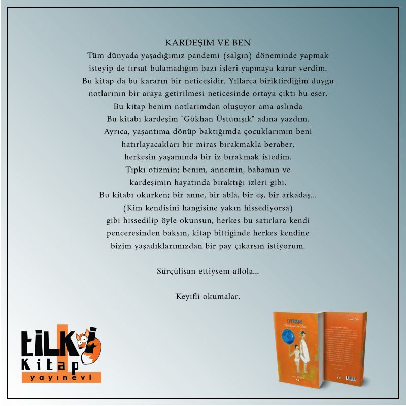 Tüm dünyada yaşadığımız pandemi (salgın) döneminde yapmak isteyip de fırsat bulamadığım bazı işleri yapmaya karar verdim. Bu kitap da bu kararın bir neticesidir. Yıllarca biriktirdiğim duygu notlarının bir araya getirilmesi neticesinde ortaya çıktı bu eser. Bu kitap benim notlarımdan oluşuyor ama aslında "Bu kitabı kardeşim "Gökhan Üstünışık" adına yazdım. Ayrıca, yaşantıma dönüp baktığımda, çocuklarımın beni hatırlayacakları bir miras bırakmakla beraber, herkesin yaşamında bir iz bırakmak istedim. Tıpkı otizmin benim, annemin, babamın ve kardeşimin hayatında bıraktığı izleri gibi.