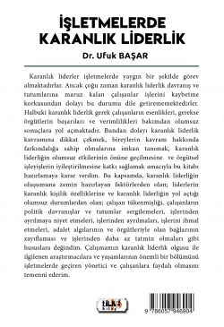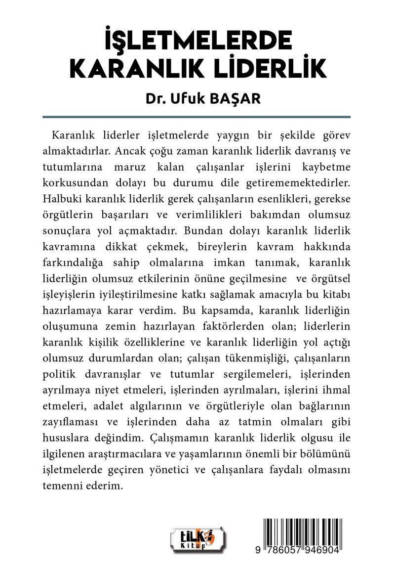 Karanlık liderler işletmelerde yaygın bir şekilde görev almaktadırlar. Ancak çoğu zaman karanlık liderlik davranış ve tutumlarına maruz kalan çalışanlar işlerini kaybetme korkusundan dolayı bu durumu dile getirememektedirler. Halbuki karanlık liderlik gerek çalışanların esenlikleri, gerekse örgütlerin başarıları ve verimlilikleri bakımdan olumsuz sonuçlara yol açmaktadır. Bundan dolayı karanlık liderlik kavramına dikkat çekmek, bireylerin kavram hakkında farkındalığa sahip olmalarına imkan tanımak, karanlık liderliğin olumsuz etkilerinin önüne geçilmesine ve örgütsel işleyişlerin iyileştirilmesine katkı sağlamak amacıyla bu kitabı hazırlamaya karar verdim. Bu kapsamda, karanlık liderliğin oluşumuna zemin hazırlayan faktörlerden olan; liderlerin karanlık kişilik özelliklerine ve karanlık liderliğin yol açtığı olumsuz durumlardan olan; çalışan tükenmişliği, çalışanların politik davranışlar ve tutumlar sergilemeleri, işlerinden ayrılmaya niyet etmeleri, işlerinden ayrılmaları, işlerini ihmal etmeleri, adalet algılarının ve örgütleriyle olan bağlarının zayıflaması ve işlerinden daha az tatmin olmaları gibi hususlara değindim. Çalışmamın karanlık liderlik olgusu ile ilgilenen araştırmacılara ve yaşamlarının önemli bir bölümünü işletmelerde geçiren yönetici ve çalışanlara faydalı olmasını temenni ederim.
